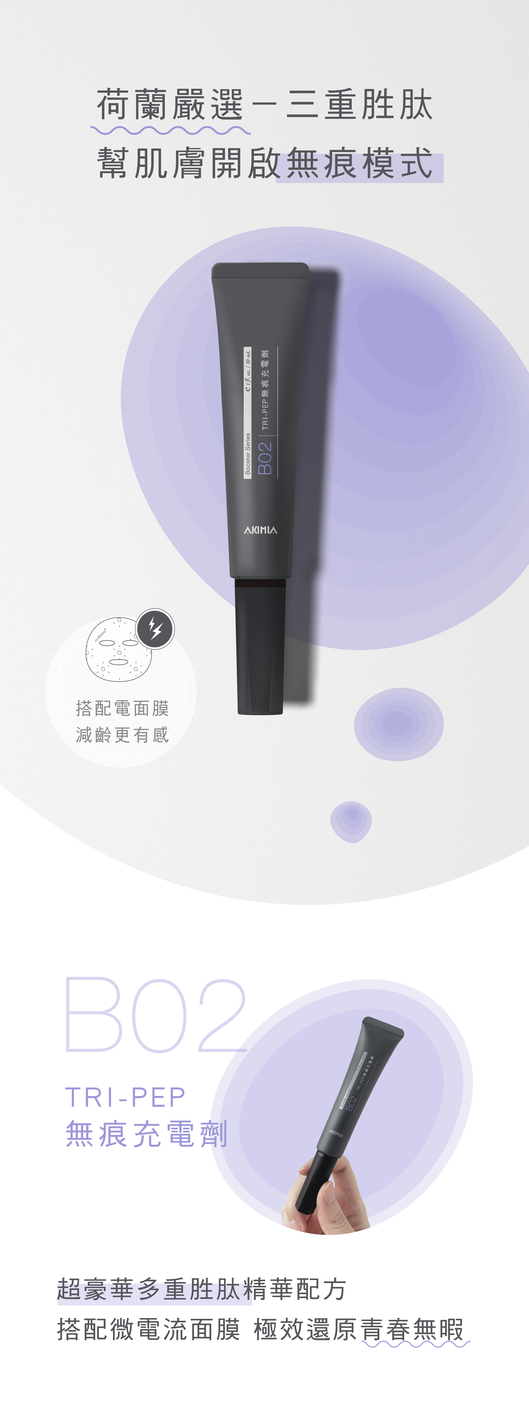 AKIMIA推薦每週三次,於化妝水後,針對局部細紋與塌陷狀況做塗抹,再搭配微電流面膜敷用,達到深層滲透、加倍功效的抗痕保養!