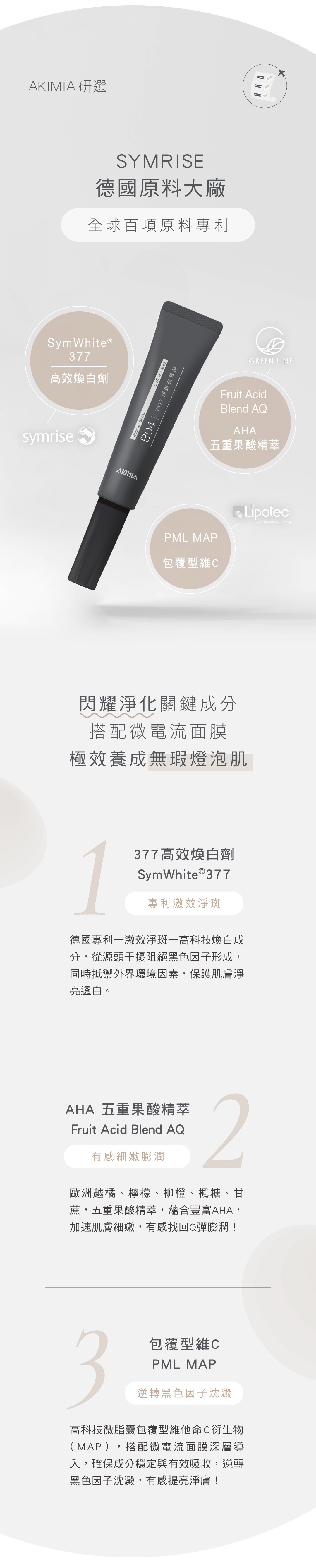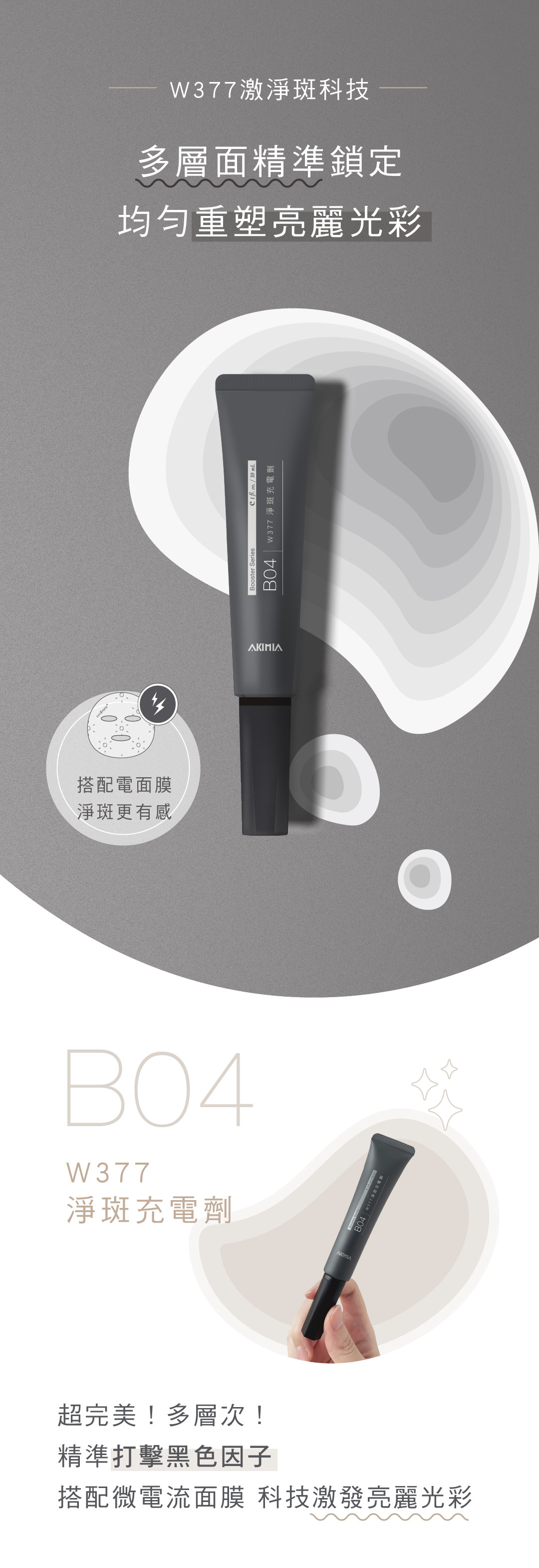 AKIMIA推薦每週三次,於化妝水後,針對黑斑、痘疤、肌膚暗沉做局部加強,再搭配微電流面膜敷用,達到深層滲透、加倍功效的淨斑保養!